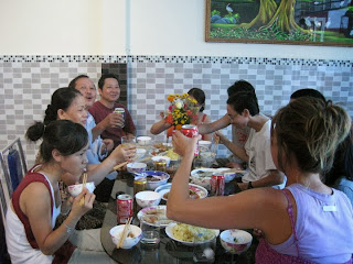 Af høflighed syntes jeg naturligvis ikke jeg kunne afvise at spise det moderen sad og dumpede ned i min skål, på trods af at jeg op til flere gange havde peget på min store veltilfredse mave med et “No no – full!”. Efter dette scenarie havde udspillet sig et par gange; jeg sagde pænt nej tak, moderen skænkede op alligevel, jeg så mig nødsaget til at spise det opøste, hvorefter den frivillige tvangsfodring startede forfra – fik Ms. Phuc omsider hvisket til mig at det i Vietnam er skik at værten bliver ved med at øse op af høflighed, men det er altså ikke ensbetydende med at man er tvunget til at spise maden, da det netop er god skik at levne således værten ved at alle gæster er mætte. Så hvis ikke Ms. Phuc havde sagt noget kunne dette scenarie være fortsat i én uendelighed, eftersom jeg jo er opdraget med at det er høfligt at spise op! I Vietnam er det altså så lige det modsatte – det er høfligt at levne! Virkelig pænt af Ms. Phuc først at nævne det EFTER jeg havde siddet og nedtvunget hele to kæmpe kålfætre på trods af den overvældende mæthed min stakkels lille bristefærdige mave følte! Hvorfor sker det aldrig for mig, når jeg får serveret oreos??? Se så ville tvangsfodring pludselig have en væsentlig mere positiv klang! Det ville til gengæld nok ikke have en videre positiv effekt på min økonomi, da flere måneders kontinuerligt oreo fråderi nok ville betyde tvungen bookning af seperate flysæder til mine lår og ekspanderede sidedeller! Sidstnævnte ville dog kunne rulles op til en praktisk pølse, der kunne bruges som opbevaringsplads til de ekstra flymadsmåltider jeg unægteligt ville bestille!